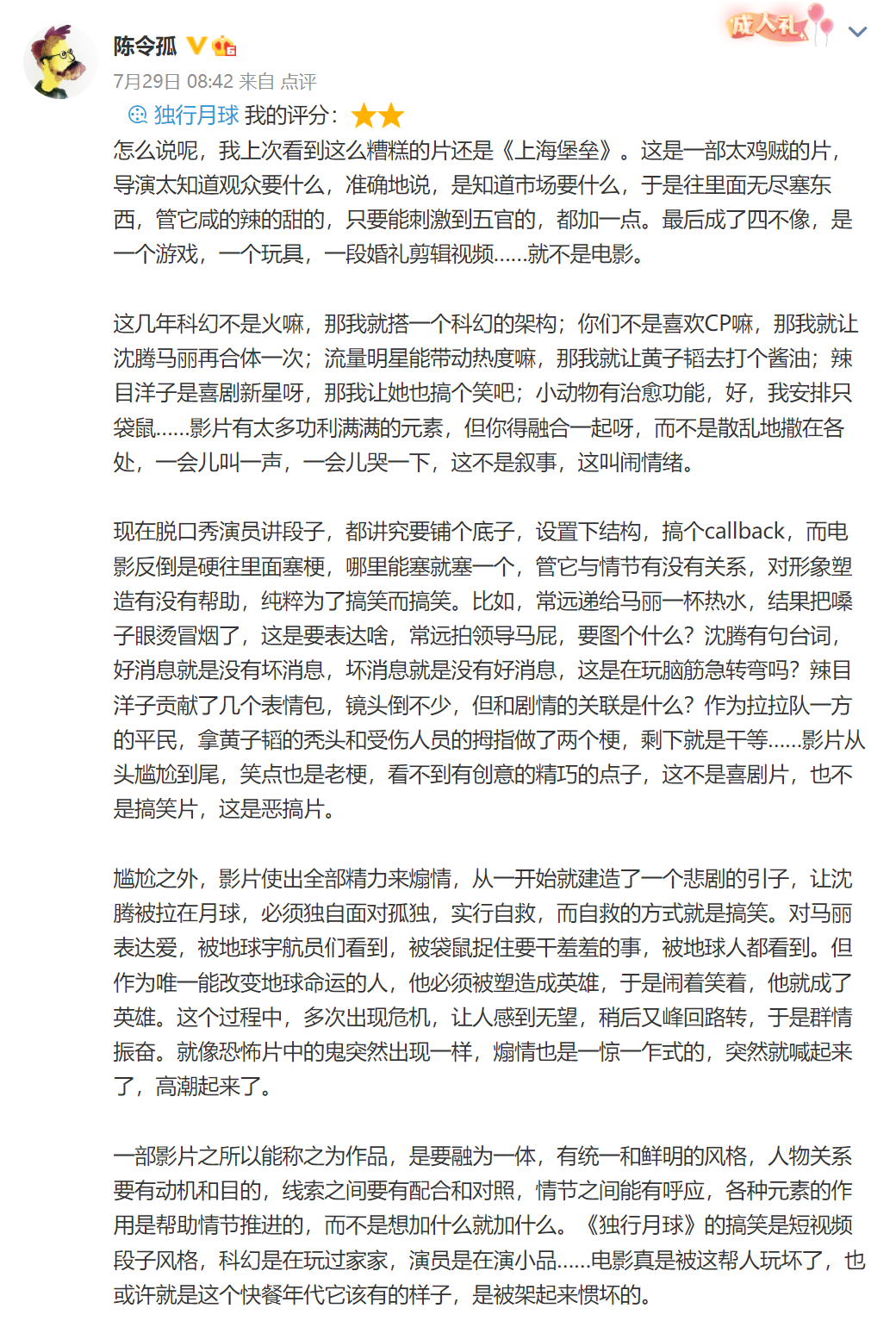 而创作过《4比3的人间》《古龙的江湖》等畅销书的知名作家、影评人陈令孤,则用很长的一篇文字批评《独行月球》,他第一段认为《独行月球》四不像,是游戏、玩具、婚礼剪辑视频……就不是电影。