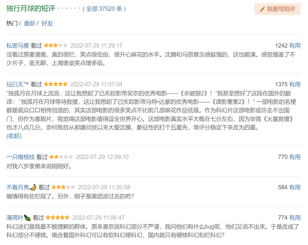 但和此前的《流浪地球》《哪吒之魔童降世》等票房成功的电影口碑一边倒的好不同,《独行月球》上映后口碑两极分化。