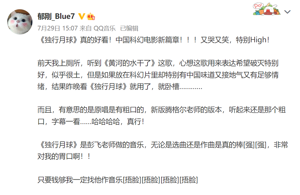 但编剧和导演向《流浪地球》致敬的意味很明显,而且《独行月球》的特效团队和《流浪地球》也是同一家。因此我们留意到了《流浪地球》的B组导演郁刚,通过社交平台发了《独行月球》的影评。他开头第一段就用了五个惊叹号,写的是“《独行月球》真的好看!中国科幻电影新篇章!!!又哭又笑,特别High!”后面则夸电影音乐,用《黄河的水干了》自己很喜欢。