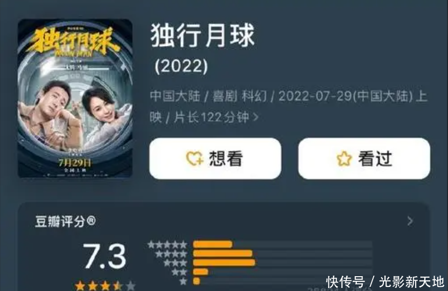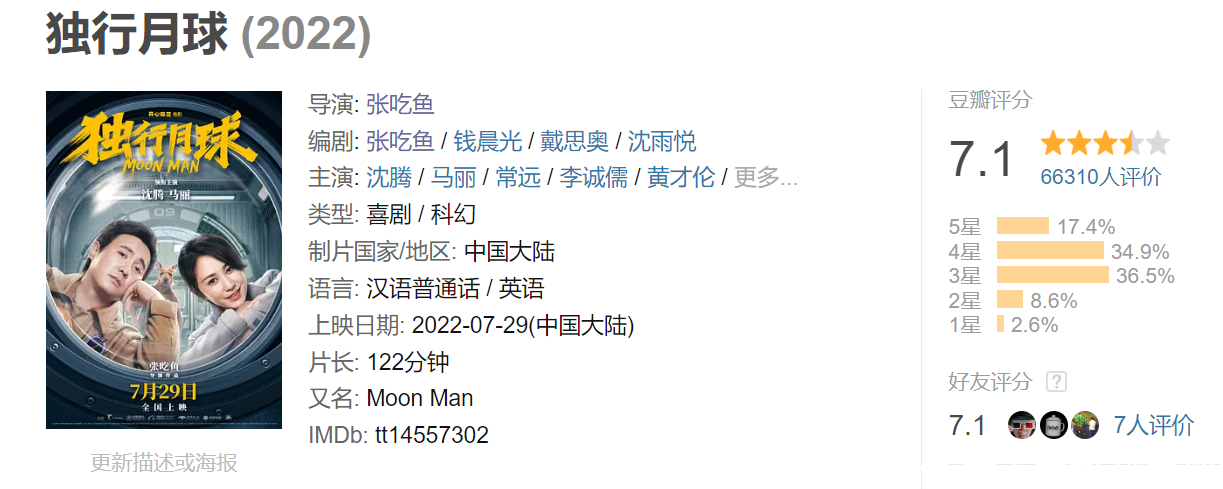 先看豆瓣,《独行月球》开分很早,开出了7.3的分数,不过随着打分观众增加,截止到发稿,评分微降到7.1。