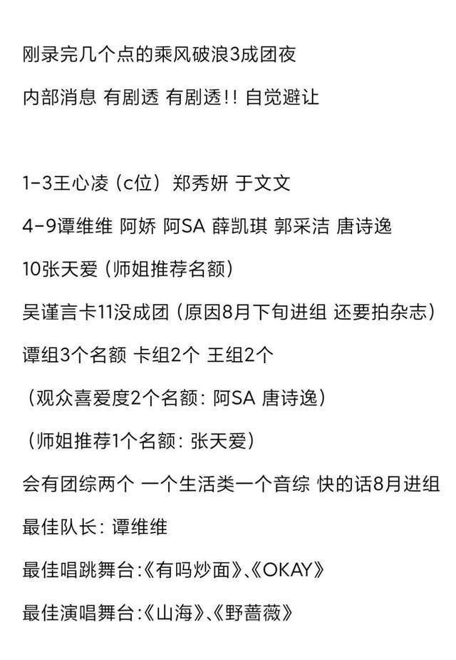 而随着几个月的角逐,节目也逐渐接近了尾声,8月2日,网上消息传出,《乘风破浪》成团夜的录制已经完成,总决赛各位姐姐的排名也已经出炉。