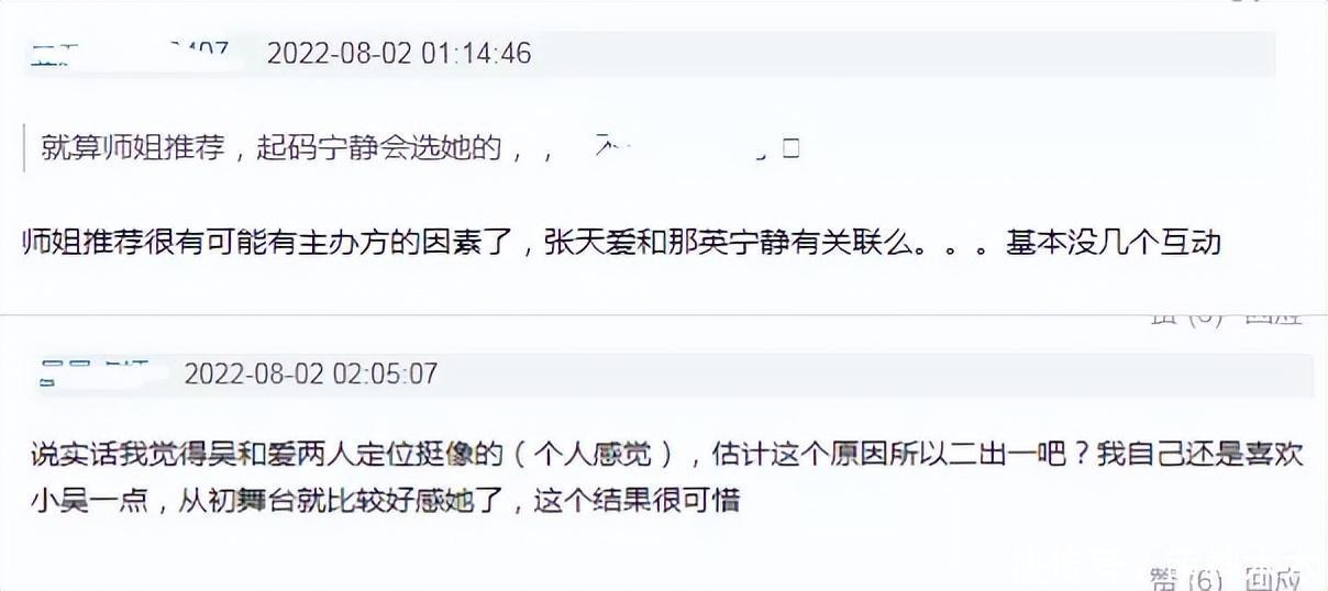 说到师姐推荐名额给了张天爱,网友就难以理解。网友整理了姐姐们的关系,发现张天爱与宁静那英两位师姐在节目中并没有太多互动,认为师姐推荐名额很有可能是节目组选人因素,暗示张天爱是本届的皇族选手。关于吴谨言卡位的讨论,网友分析后认为她与张天爱定位相似,只能二出一。