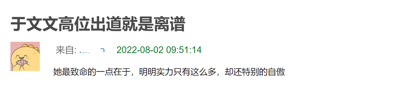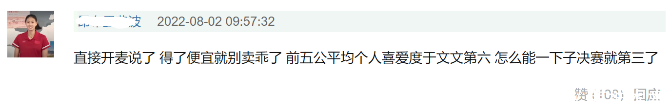 另外,对于于文文莉亚谭维维、薛凯琪、tcins成团,网友也有不少质疑,认为她的实力跟成绩不匹配,还引用了朋友的评价,称于文文特别自傲,致命的是才华实力跟不上。在《浪姐3》整个赛程中,于文文没有赢过一场比赛,靠着“到处送琴”的噱头组了一大堆CP。不少网友看到她,就觉得剧本流程安排得太顺,比第一届的皇族万茜剧本要成熟许多。