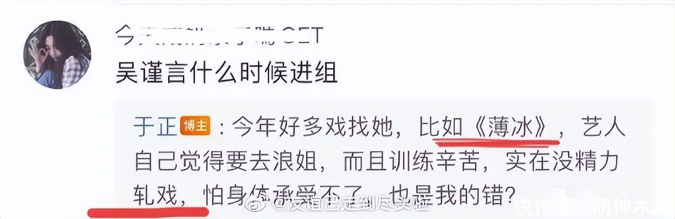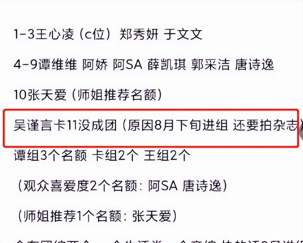 当然,也有网友称吴谨言是因为后续工作原因无法成团,后面要进组,还要拍杂志,这些合同都是赛前签订,大家都是照着合同走。这个说法也不是不可能,但是放在吴谨言身上就太奇怪,赛前于正透露吴谨言为了参加《浪姐》推了一部剧,最后未能成团的原因是要进组。那费这么大功夫干嘛呢?不管怎么说,她是王心凌组唯一没有成团的成员,就还是很可惜。