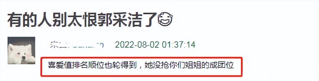 郭采洁在成团位显得有些孤零零,没有爆火的CP也没有高话题度,舞台也中规中矩,就有网友觉得她不该成团。而事实上,郭采洁的喜爱度并不低,每场都很靠前,只是偶像和粉丝都很低调,没有特别出圈的舞台。