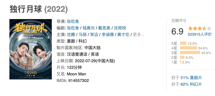 而造成这样子,主要还是因为该片中毫无惊喜的搞笑桥段、李诞都唾弃的谐音梗,还有舔果酱、赤裸全身、扮母袋鼠险遭侵犯等恶俗桥段,《独行月球》在喜剧输出上很像小品和脱口秀,但顶多是不入流的脱口秀,连个像样的callback都没有,作为喜剧片,不及格。同样,作为科幻片,该片也是不及格。